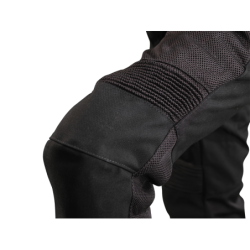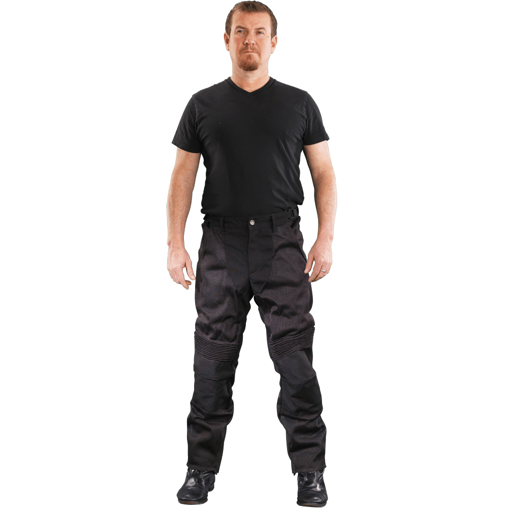 Vanson Vent Pants are constructed for warm weather riding with strategically placed heavy-duty mesh cutouts for enhanced ventilation at the inner thighs, behind the knees, and below the waistband at the rear. Even the rear ankle-zipper gussets are made of heavy-duty mesh - combining low-bulk comfort (when zipped closed) with flow-through ventilation on warmer days. Extra leather reinforcements at the knees, with pre-installed armor (Floating Armor System US Patent 6070274) and hip pads, provide added protection. Waistband adjustment works with a cam-lock slider system making it possible to fully adjust for size, underlayers and comfort. Racing-suit-style expander panels above the knees make almost any riding position a breeze. "Easy does it", could well be the motto for our Vanson Vent Pants.