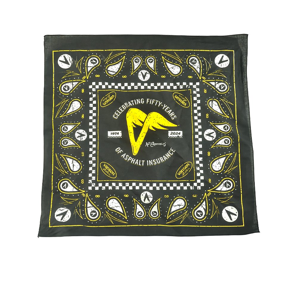 Everybody can use a Bandana; Cowboys, Engineers, Riders...even Lawyers (to wipe away tears?). What better way to mark 50 years of Vanson than to make a cool special edition Bandana? Right here, in the USA.