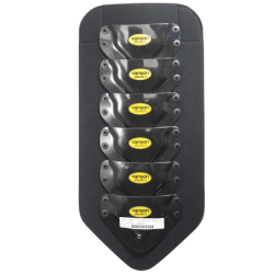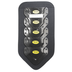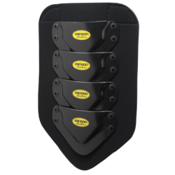 To that we rivet, using nylon medical rivets, custom molded HDPE (High Density Polyethylene) shapes that nest, one partially over the one above it, providing an uninterrupted yet flexible barrier of protection along the center of the backpad.