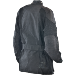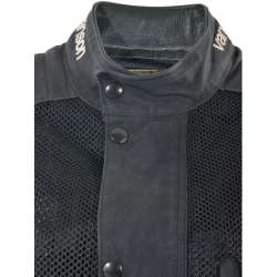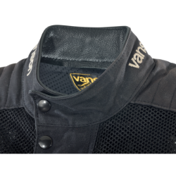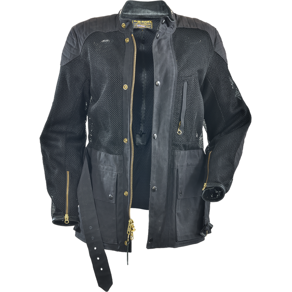 BLACK CORDURA 1000 DENIER HEAVY DUTY MESH + BLACK ARMY DUCK 1010 WAX COTTON are combined to create a unique hybrid jacket ideal for hot weather riding. The Cordura mesh is very strong and abrasion-resistant while also allowing maximum airflow. V150 BLACK HEAVY-DUTY VENT MESH High-tenacity 1000 denier nylon yarn is used to knit this mesh material. It is finished with a bonding treatment that enhances the strength of the material. You can feel this in the hardness of the material to the touch . ARMY DUCK 1010 ( 10 oz. ) BLACK Waxed Cotton Wax cotton combines breathability with water repellency which make the material very comfortable in a wide range of conditions. Wax cotton can be reconditioned and re-proofed using the Vanson wax sold separately. Use a hair dryer to heat the area of the garment needing wax + work the wax paste into the Duck using a dry cloth and a circular motion. Note: Do not wash or dry-clean this garment as it will harm both the coating on the Cordura and the wax in the wax cotton. To clean this garment simply hose off with cool water and air-dry in a cool place.