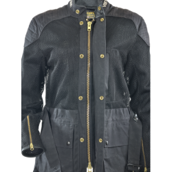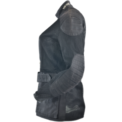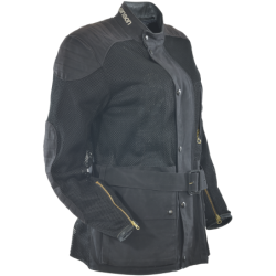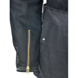 Start with the 1000 denier Cordura heavy mesh that makes up most of the outside shell. Cordura yarn was developed by DuPont to replace the steel used in radial tires. It is strong. It resists abrasion. It does not degrade. Knitted into a heavy-duty mesh it brings you all these qualities and allows 100% airflow. Once you touch the material you can feel the toughness. To this we add 1010 Army Duck waxed cotton, also a very strong but breathable material. It has a natural look and feel, and like the Cordura mesh only needs to be hosed off, then air-dried, for true on-the-go round-the-clock use. In the shoulders a double layer of military-derived ballistic nylon spacer fabric is used, which resists compression, so giving additional padding and energy absorption. It offers little resistance to airflow, so cooling air can flow through it when you are hot.