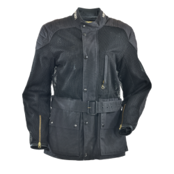 This jacket is cut like a military dress tunic, hip-length for comfort, and with a two-way center-front zipper for a perfect fit on the bike without bunching up. This zipper is covered by a snapped storm-flap, to avoid scratching your tank. CE-approved protection is included at the shoulders and elbows, with a backpad in a pouch sewn into the lining. Its uniform-style full belt has a leather-covered buckle . . . again we thought of your tank. A leather keeper, embossed with the unit number of the jacket, is on your left side near the buckle, making sure the belt stays with you. The sleeves are finished with race-style turned leather ends, and leather guards are under the wrist zippers.