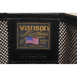 Along the inside back panel is a two compartment mesh pocket with a leather bead across the top. The Vanson Unit Number is embossed into a leather patch top stitched to the mesh pocket.