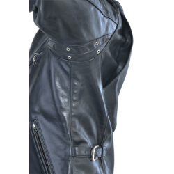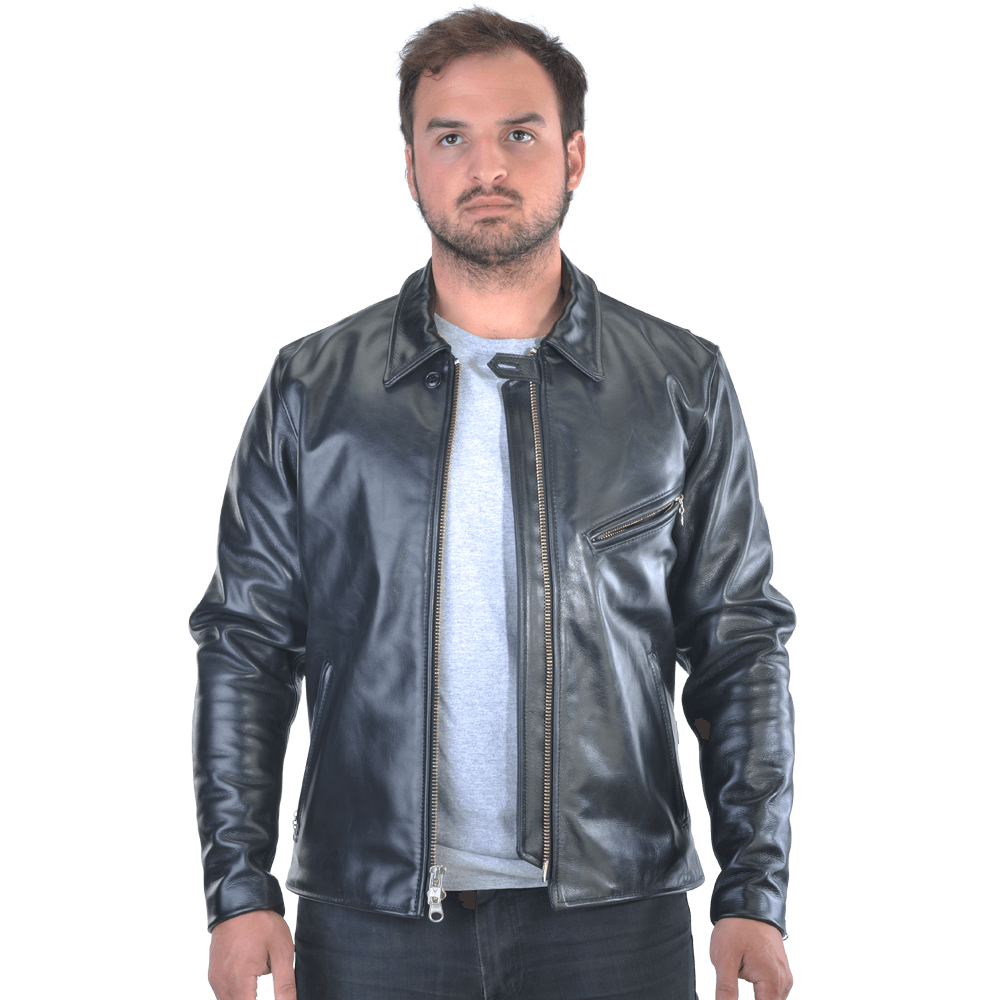 In some ways a leather motorcycle jacket reflects the mood of the country at any given time, and in that sense it becomes a product of those times.  So it is with the Vanson ROYALE (ENFIELD) JACKET.  Ronald Reagan was president and the country was feeling  confident once again - comfortable in its abilities, not afraid of standing for an ideal, moving ahead in what seems in retrospect to have been a simpler world. These sentiments are captured in the design elements of the Vanson ROYALE (ENFIELD) JACKET. They include:  casual in the use of a shirt-style collar comfortable in the use of open-top, leather-lined hand pockets confident in the use of large panels with a one-piece back that requires careful hide selection and cutting.  Vanson's version of the ROYALE (ENFIELD) JACKET is a modern classic-casual shiny zirconian black leather mens jacket an expression of American confidence and surefootedness in an unpredictable, wobbly world.