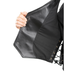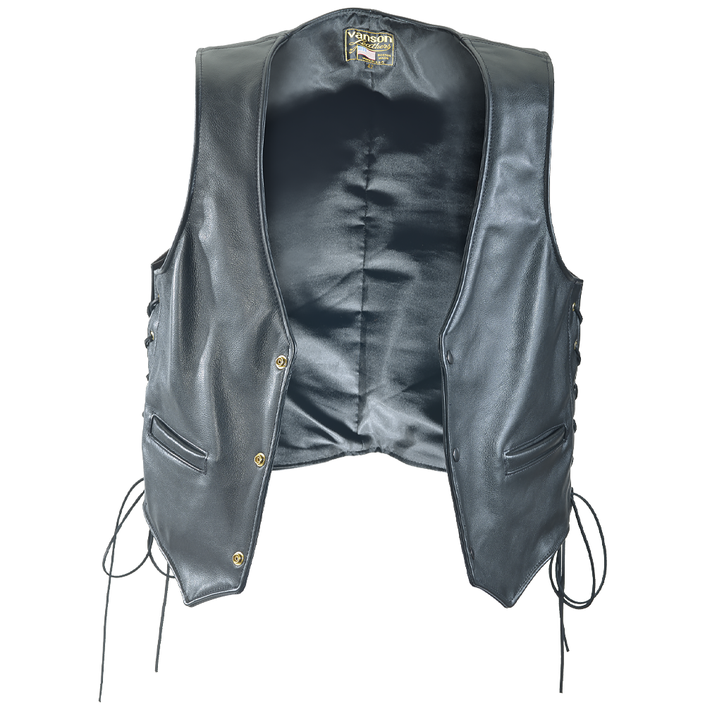 Another enduring Vanson classic our good-looking, beautifully-made Snap-Front Vest features two front pockets and lace-up sides for an adjustable fit. The VLS is meticulously hand-crafted with a man's formal dress construction in the way the backs and fronts are joined at the shoulder. Look closely and you'll see that all the connection points are perfectly joined and top-stitched, open and flat for a low bulk, smooth fit over the shoulders. You'll also see how the sides are turned and faced evenly so the lining is smoothly set into the vest and the brass side-lacing grommets are neatly set away from the lining in two reinforced layers of leather. Rawhide laces give a cowboy flair and enable a perfectly snug fit. The two single-welted front pockets show the classic heritage of this vest. Available in either competition-weight cowhide or medium-weight Firenze leather. This is a dress vest gone riding and can be worn anywhere.