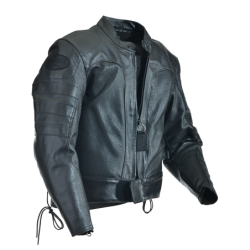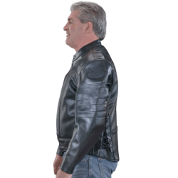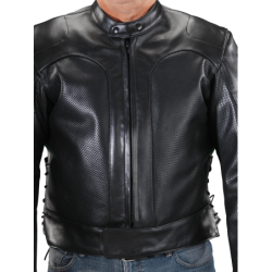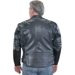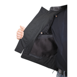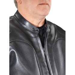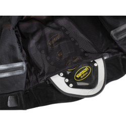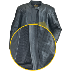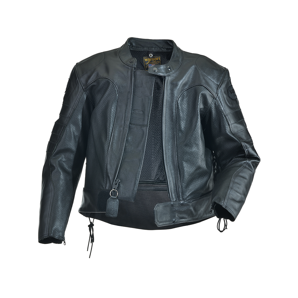We kept technical attributes from our SportRider jackets: Velcro-closed front waistband, armor capabilities, mesh lining (here with two zip-pockets), collar and windflap. Our patented F.A.S. (Floating Armor System) attaches armor to the shell. Shoulder and elbow armor is pre-installed; the back pad is optional. The three-way jacket-to-pants connection system is present, and this jacket will acccept the optional Vanson Streamliner Vest.