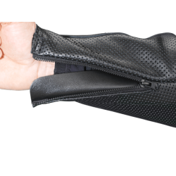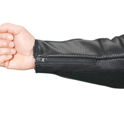 Starting with a Technical Jacket, with chest, back and sleeve inlays of ProPerf leather for full ventilation, we added racing suit details: expander sections at the lower rear of the armholes, raw-edged sleeve ends, and wrist zippers with guards instead of gussets. From the Hardcore Jacket we took the strengthened kidney panel and adjustable side-laces, adding racing armbands in the bicep area of the sleeves.