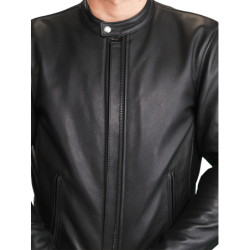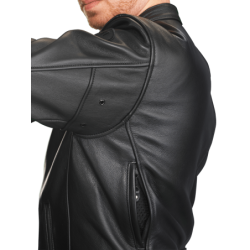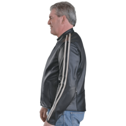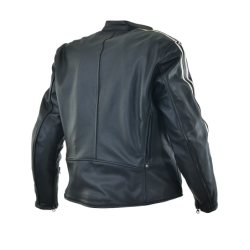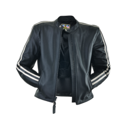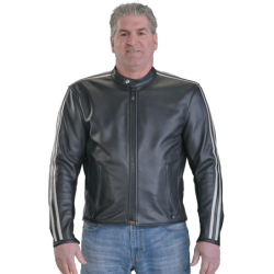 BLACK FIRENZE JACKET WITH BONE LEATHER SLEEVE STRIPES Selected skins are gently tumbled for extra softness and a slight pebble look. Milling brings the grain up making the natural markings a little more pronounced. Garments made of this leather will require very little breaking-in time as the leather is soft and supple right away. These Medium Weight leathers gauge about 1.2 mm.