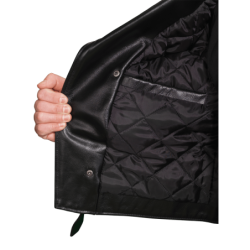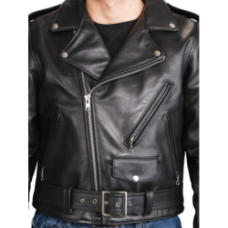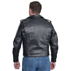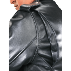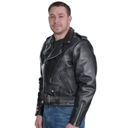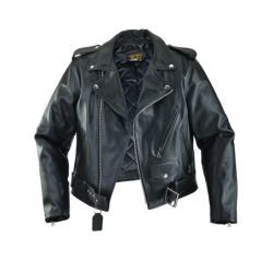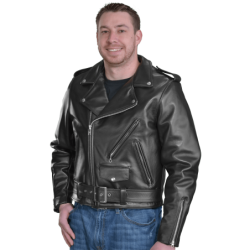 Good for a night out with friends, too. Beautifully cut with a huge one piece back no seams, no tiny little pieces puzzled together to save leather. Big generous front panels too. This jacket is cut and built in the old way, which would be called uneconomic today, but we call No Compromises. Full-size 2" wide half belts sewn into the side seams, with a big polished nickel-plated solid brass buckle to keep the waist snug. Available in both competition-weight and medium-weight cowhide. With zippered hand pockets, a zippered glove pocket, even a snap-close cigarette/ cellphone pocket, and classic chrome hardware throughout. Hand built in America. Destined to become a prized heirloom. In a word, Thunderbird!