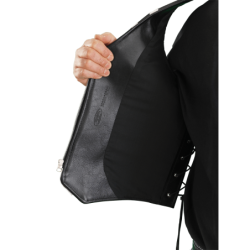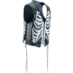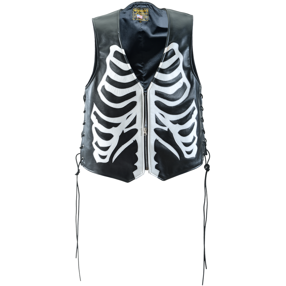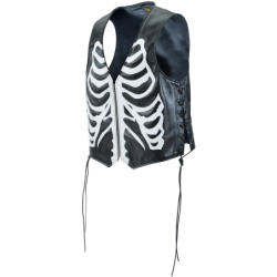 The Vanson Bones motif from our famous flat track racing suits is carefully cut out of leather and edge top-stitched onto the vest. We start with the design of a man's formal dress vest. Look closely, you will see that the connection points of the front and back are perfectly matched and top-stitched, open and flat for a comfortable low bulk, smooth fit over the shoulder. You'll also see that the sides are turned and faced evenly so the lining is smoothly set into the vest and the brass side lacing grommets are neatly set away from the lining in two layers of leather. Substantial rawhide laces give this formal cut vest a Western flair and enable a perfect fit. Twin single-welted pockets cut into the front add a formal look to the style. This vest makes a statement wherever you may go.
